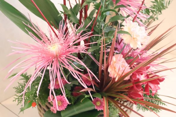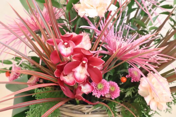 枝:サンゴミズキ 葉:イタリアンルスカス 赤:シンビジューム 桃:イトギク 桃:カーネーション 赤葉:ドラセナ