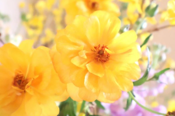 枝:レンギョウ 黄:ラナンキュラス 白:ストック 紫:ストック 葉:ドラセナ